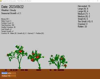 ๐ The current date, weather, season growth multiplier, and stats like harvest count and tomato size distribution are displayed in real-time on the screen.